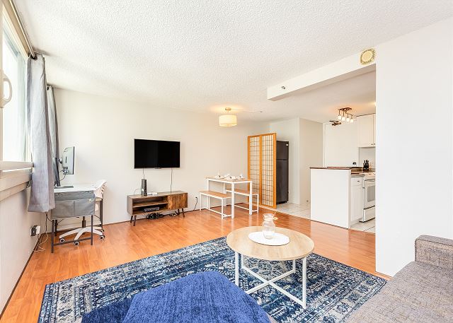 12階のシティー&マウンテン ビューの1ベッドルームのユニットは、フルキッチン、広いラナイが特徴的。コの字型のキッチンは自炊も必要なファミリーにも便利です。リモートウォークや学生にも便利なデスクもあり、長めのステイにも人気となっています。
