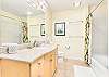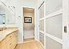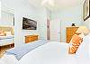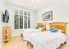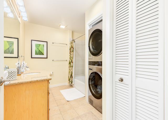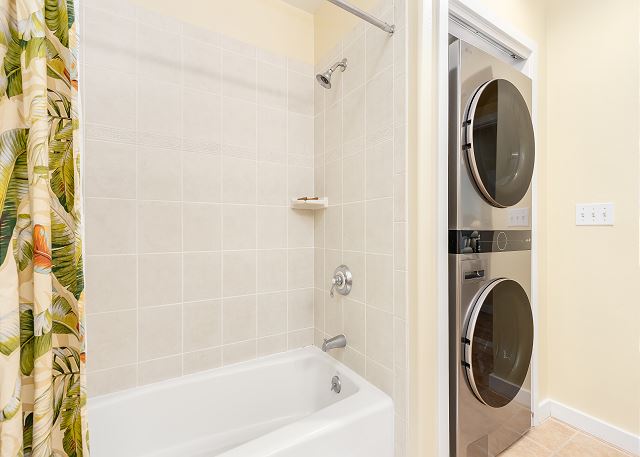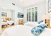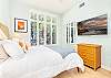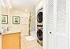 キッチンの廊下には、洗濯機と乾燥機を備えたゲスト用バスルームがあり、さらに便利です。廊下の奥には、クイーンサイズベッド1台とツインベッド2台を備えた2つ目のベッドルームがあり、どちらのベッドルームもゲストの皆様に快適にお過ごしいただけるよう設計されています。リビングルームのソファベッドは追加の睡眠スペースとして活用でき、最大8名様まで快適にご宿泊いただけます。