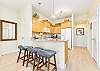 家に入ると、広々としたダイニングエリアとリビングルームを備えた、開放的で居心地の良い間取りが迎えてくれます。ご家族やご友人との集まりに最適です。左側に位置するオープンコンセプトのキッチンは、あらゆる調理ニーズに対応する設備が整っており、バースツール付きのアイランドキッチンは、カジュアルな食事や朝のコーヒーを楽しむための追加の座席としてご利用いただけます。