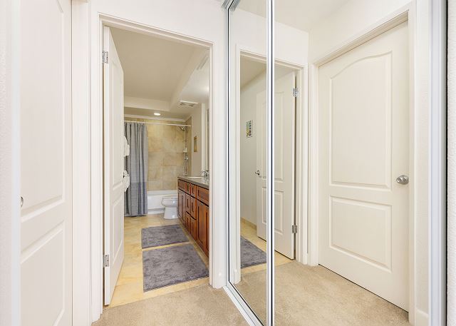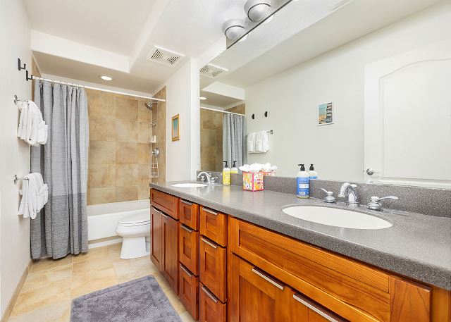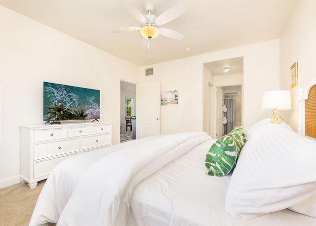 マスタースイートは、キングサイズベッド、薄型テレビ、遮光カーテン、広々としたウォークインクローゼットを備えた、まさに隠れ家のような空間です。ダブルシンクと広々としたカウンタースペースを備えた専用バスルームは、まるでスパのような空間です。ヴィラの反対側にあるセカンドベッドルームには、クイーンサイズベッドが2台あり、ご家族やゲストに最適です。近くにはゲスト用バスルーム、そして便利な廊下のクローゼットには洗濯機と乾燥機が完備されています。広々としたプライベートガレージは、十分な収納スペースと、冒険に必要なビーチ用品をご用意しています。