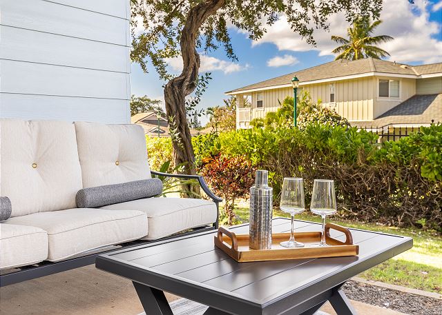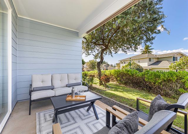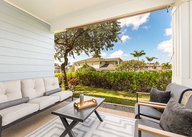 大きなスライドドアを開けると、トロピカルガーデンの絶景に囲まれたヴィラの1階プライベートラナイへと続きます。誰もが座れる椅子を備えたこの屋外スペースは、まるで家の延長のように、朝のコーヒータイム、午後の読書タイム、島のそよ風に吹かれながらゆったりと会話を交わす夜など、あなただけの空間です。静かな庭園に囲まれたこのヴィラは、コオリナ・カイでは他に類を見ない、プライバシーと静寂を感じられる空間です。