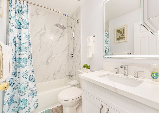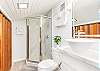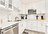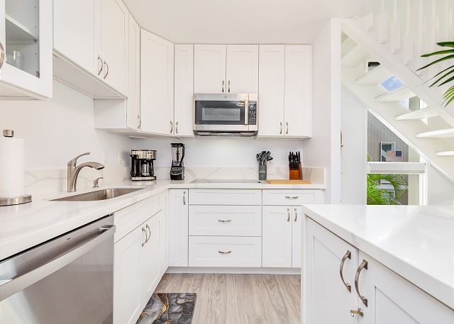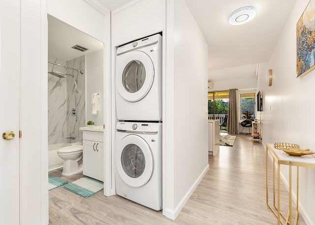 メインフロアにはアイランドカウンター付きのオープンキッチン、フルバスルーム、廊下には洗濯機と乾燥機があり、長めのバケーションにもおすすめです。