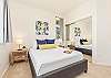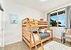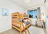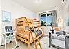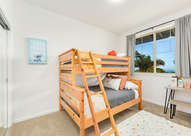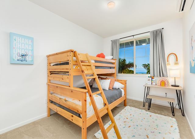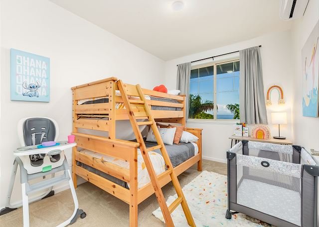 2階には、さらに広々としたベッドルームが2つあります。1つはクイーンサイズベッド、もう1つはお子様向けに特別に設計されており、上段にシングルベッド、下段にフルサイズベッドを配置した楽しいトランドルベッドのセットアップに加え、お子様がまるで自宅にいるかのようにくつろげる明るいインテリアが施されています。共用のバスルームは廊下にあり、便利です。