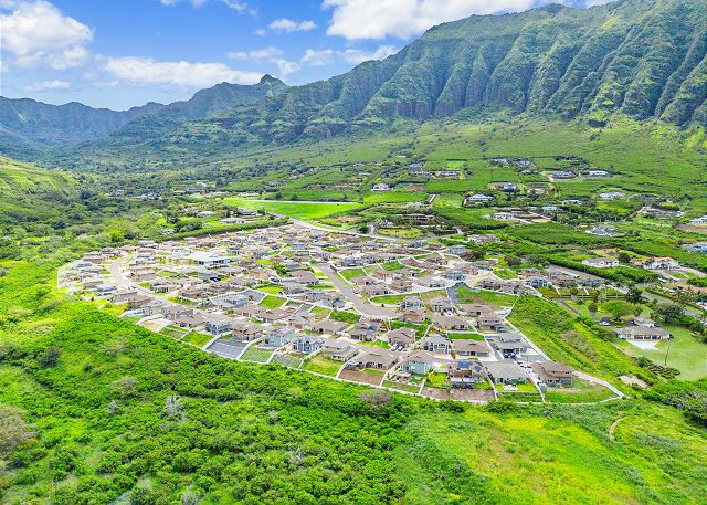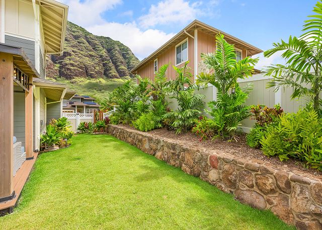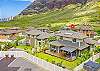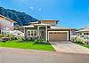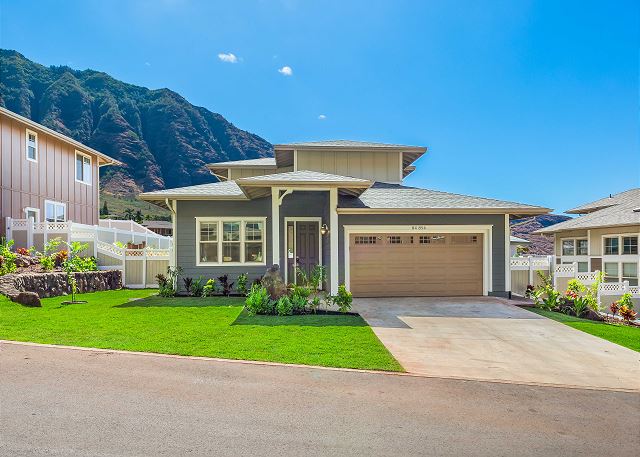 オアフ島の西側、マカハバレーに2023年に建設されたゲートコミュニティー、コテージ・アット・マウナ・オルの大きめの一軒家。清々しい芝生が気持ちの良い2階建となります。