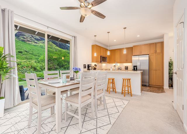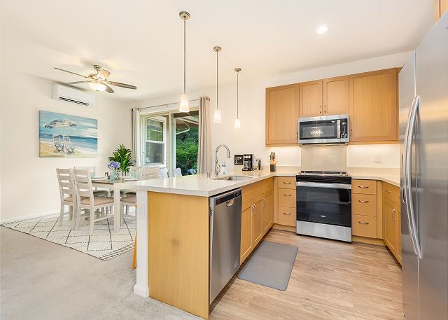 オープンコンセプトのキッチンは明るく開放的。モダンな使いやすい電化製品、料理道具も揃っています。そのままプライベートパティオでバーベキューも良いですね。穏やかな貿易風とそよぐ木々に癒されます。