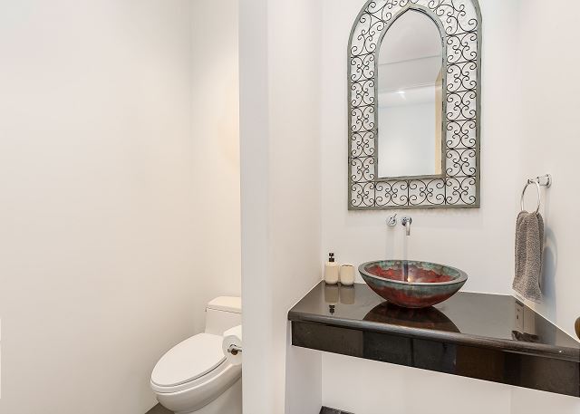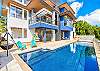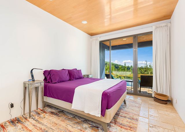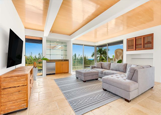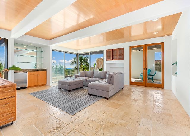 間取りはとてもゆったりと広く、4つのフルバスルームと1つのハーフバスがある贅沢な造り。プール前にはウェットバー付きの巨大なファミリールームがあり、エアコンなしで山の風と貿易風が入ります。