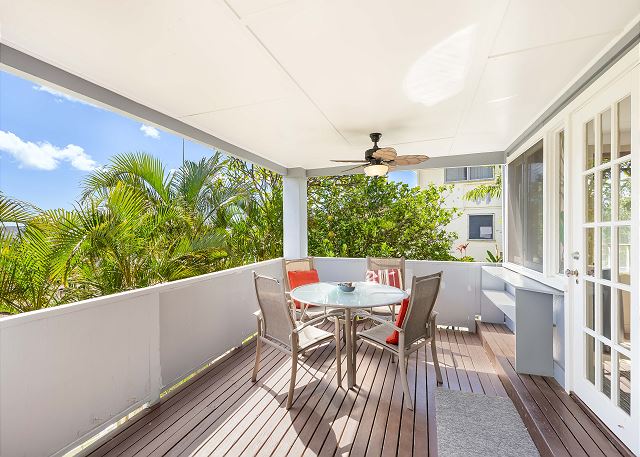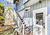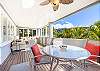 外に出ると、熱帯植物に囲まれた静かで開放的なラナイと庭が広がっています。そこには屋外ダイニングスペース、炭火グリル、そしてプライベートな屋外シャワーが備えられています。カイマナビーチやマジックアイランドで一日過ごした後に、さっぱりと体を洗い流すのに最適な、嬉しい設備です。