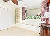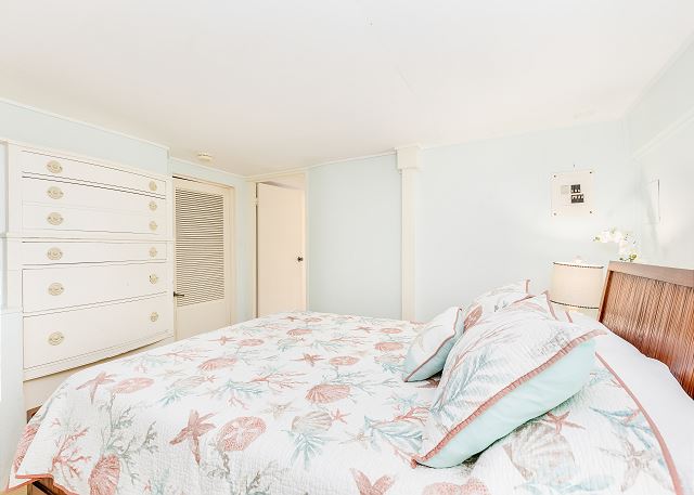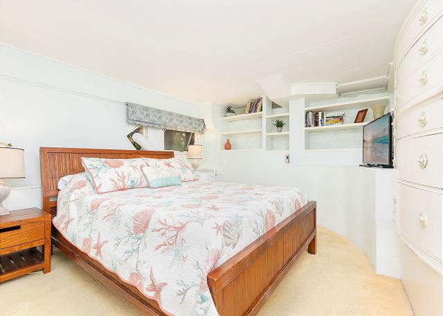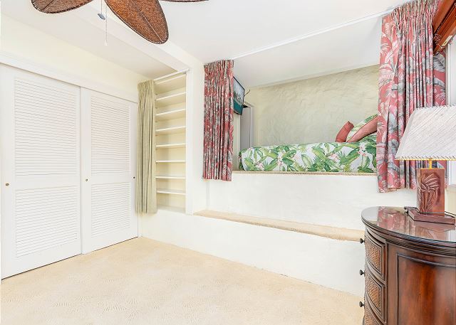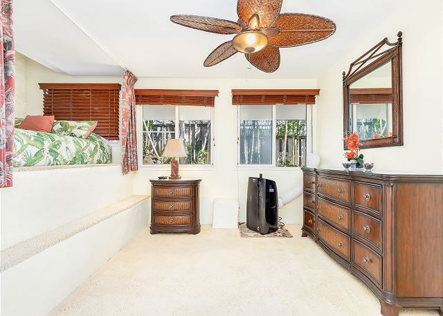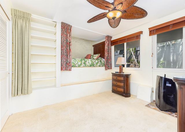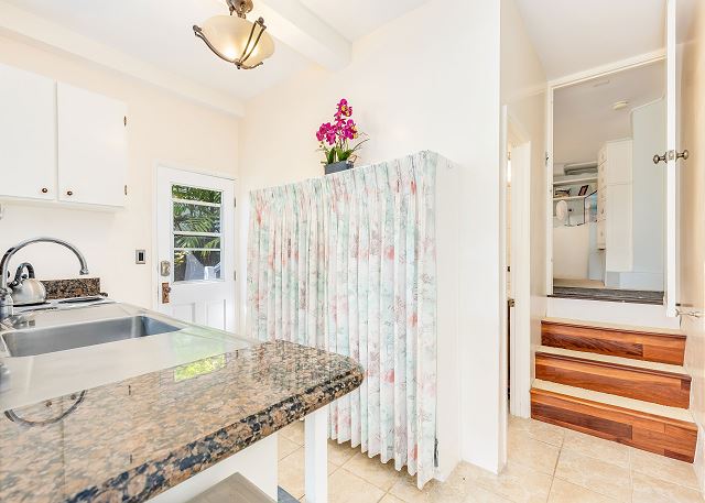 ハレ・ホオマリエには快適なベッドルームが2つあります。メインベッドルームにはクイーンサイズベッドと薄型テレビが備え付けられており、2つ目のベッドルームには、プライバシーカーテン付きのユニークな高床式クイーンサイズベッドが設置されています。居心地の良い、プライベートな寝室空間です。無料Wi-Fi、ケーブルテレビ、シーリングファン、エアコン、共用の洗濯機と乾燥機も完備されており、快適で便利な滞在をお楽しみいただけます。