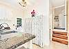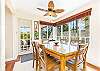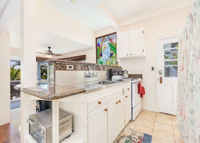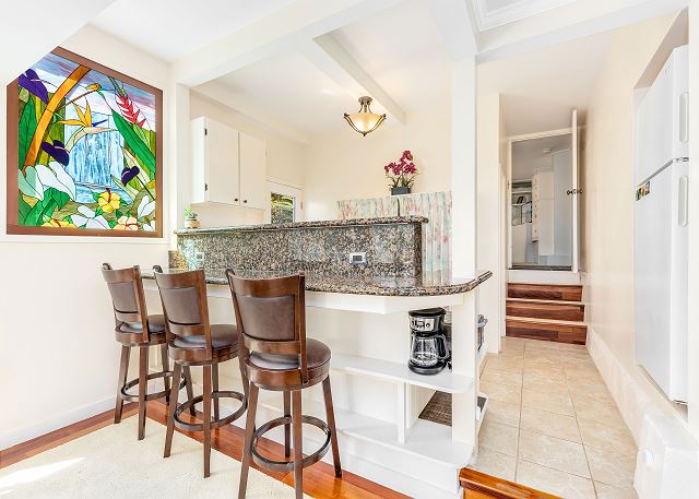 キッチンは、オリジナルのキャビネットやクラシックな備品に、御影石のカウンタートップとステンレス製のシンクを組み合わせることで、ヴィンテージ感あふれるハワイらしい魅力を保っています。朝食用のカウンターには3席あり、カジュアルな食事に最適です。一方、フォーマルなダイニングテーブルは6人掛けで、家族や友人とゆったりと食事を楽しむことができます。家全体に施された特注のステンドグラスの窓は、伝統的な島の職人技を称える、鮮やかで温かみのあるアクセントとなっています。