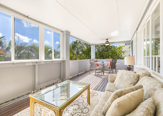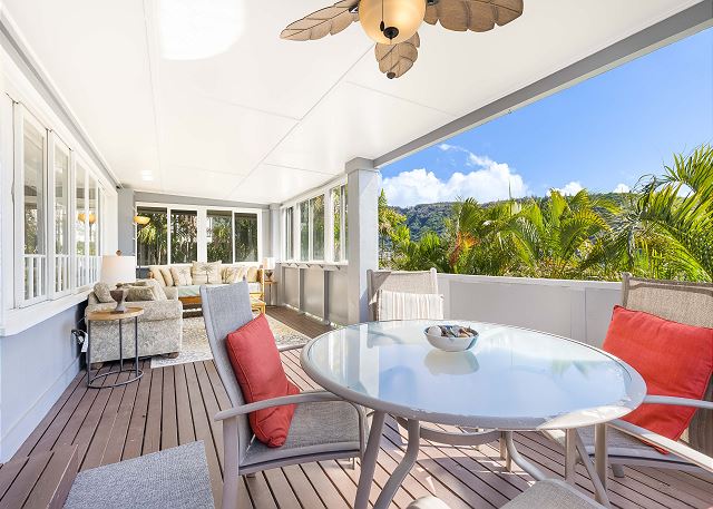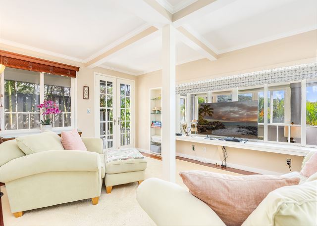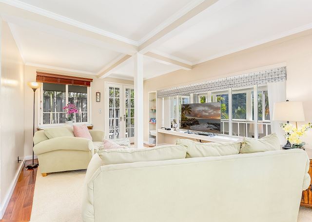 室内には、ゆったりとくつろげる快適なリビングスペースが2つあります。メインのリビングルームには快適なソファと薄型テレビが備え付けられており、ホノルル観光後のくつろぎのひとときに最適です。囲われたラナイにある2つ目のラウンジスペースは、家全体を美しく広げ、ダイヤモンドヘッドとホノルルの街並みのパノラマビューを楽しむことができます。柔らかな座り心地の家具、自然光、そして穏やかな雰囲気に包まれたこのラナイは、まるで室内庭園のような空間。読書をしたり、会話を楽しんだり、あるいは谷から吹き抜ける心地よい風を感じながら過ごすのにぴったりの場所です。